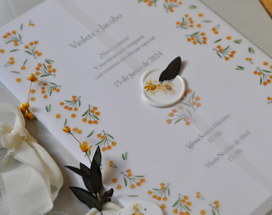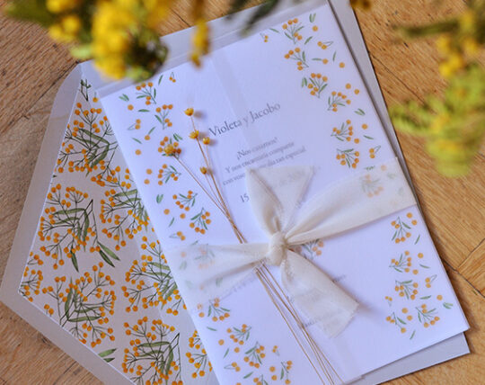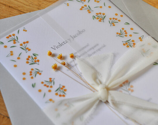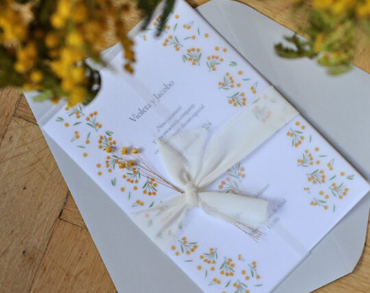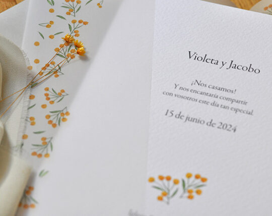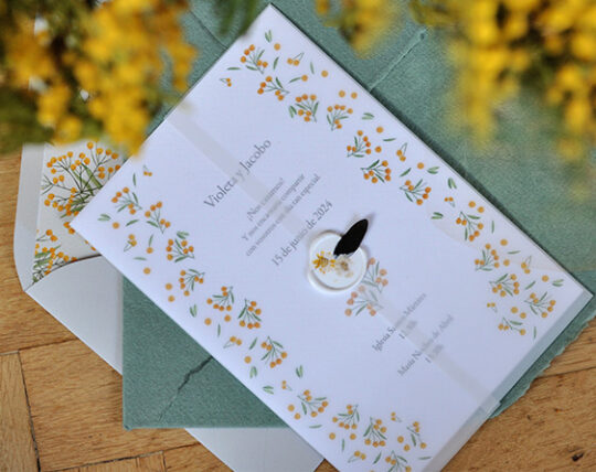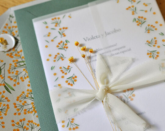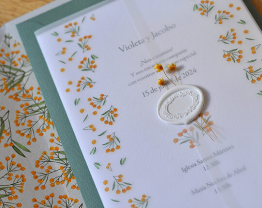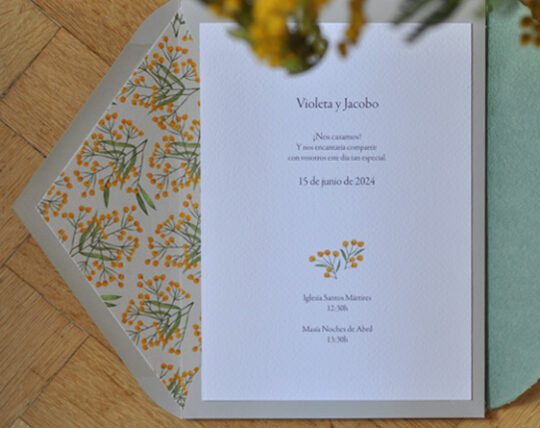 Otras piezas: No incluidas. Puedes darle el estilo que quieras con la elección del sobre o del complemento. Visitar sobres. Posibilidad de cualquier pieza a juego: tarjeta, plano, minuta, meseros o seating.